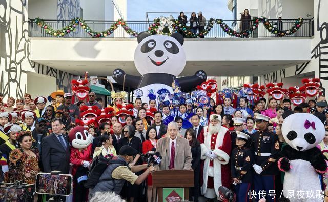 11日(星期一)上点,在好莱坞星光大道举行届圣诞大游行新闻发布会,洛杉矶众多的政要、明星、社会名流,以及来自世界各地的媒体出席新闻发布会。在发布会现场耸立着一只英尺的充气大熊猫,特别醒目并招人喜欢;美华联好莱坞圣诞大游行总策划陈慧碧女士发表了热情洋溢的讲话,同时介绍了华社的准备情况;50人组成的小狮子队表演了舞狮和狮子舞,连续的川剧变脸使得在场观众惊叫不止;10名旗袍队员,展现得绚丽多姿;一只卡通大熊猫在新闻发布会现场来回走动与各位嘉宾频频互动。